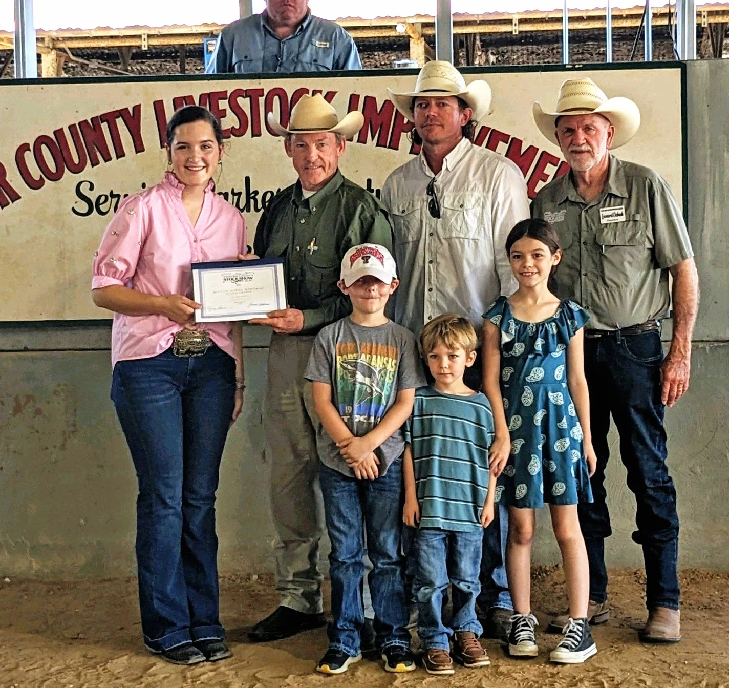 Board member Ronnie C. Harms (second from left) together with other Harms family members, present the 2024 Melton Harms Memorial Scholarship to Landrie Austin (left) of Weatherford FFA.